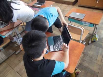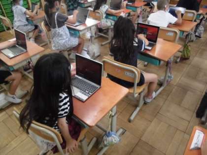今日は,ロイロノートを使って,課題を提出する練習をしました。初めてなので,自分の好きな色の背景に名前を書いて提出してみました。全員が提出できるとみんなで大喜びでした。どんなものができたか順番に紹介したところ,自分の名前が出るとホッとした様子でした。作業を終了して片づけることはとてもスムーズにできました。
