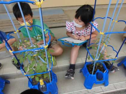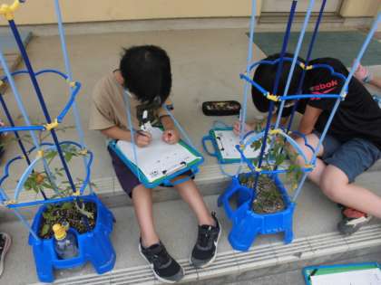 生活科の時間には,ミニトマトのかんさつをしました。ずいぶん大きくなってきたので,支柱を立てて倒れないようにしています。中には,実が赤くなっているものもありました。もっといっぱいトマトができるように,これからも水やりを欠かさずお世話していきます。