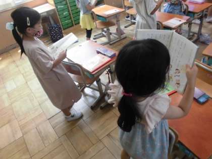 「おもちゃ」「ぎょうれつ」「しょうてんがい」など,小さな「や・ゆ・よ」のつく言葉を学習しました。聞いたことのある言葉でも書くとどうなるか分かりました。その後,「あやとり いすとり あいうえお」「かきのみ くわのみ …」の音読をみんなでしました。
