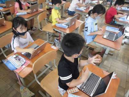 算数の時間には,たし算の練習をしました。ノートに書くのではなく,今日は,タブレットに答えを書きました。画面に映し出されるたし算の式を見て,計算ができた人から答えを書きました。