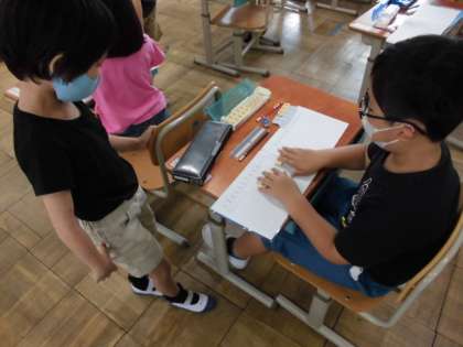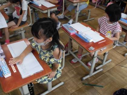 「かえるが5匹います。2匹帰りました。のこりは?」何匹になるか考えました。次は,7人いたところ3人帰ったので,のこりは何人になるか?数図ブロックを操作しながら考えました。自分の考えた動きをおとなりの人に見せながら操作しました。