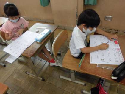 算数の時間には,ドリルを使ってたし算やひき算の筆算に取り組みました。学習したことを思い出して,答えを確かめる計算にも挑戦していました。計算問題は,繰り返し解くことで速く正確にできるようになっていくので,これからも算数タイムなどで取り組んでいきたいです。