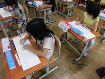 あめが8個あって3個食べると残りの数はいくつになるか考えました。「食べる」ので,あめの数が減ることに気づき,ひき算をすればいいことが分かりました。今日は,ノートに「8−3=5」という式を書きました。