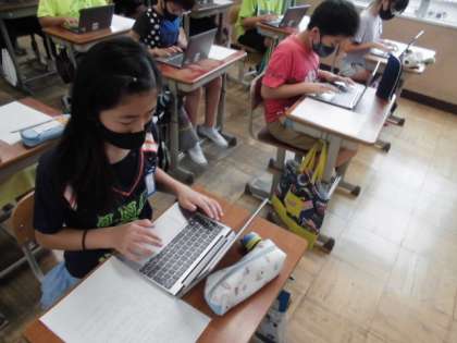 1人1台のタブレットが導入され,電源を入れたりパスワードを入力したりして,少しずつ使い方が分かったきました。自分たちで起動させることもできるようになり,いくつかのソフトの使い方も分かりました。今日は,タイピングのスキルアップのために,昔話をワードで入力しました。ローマ字入力なので,迷うこともありましたが,練習を積み重ねることで慣れていってほしいです。