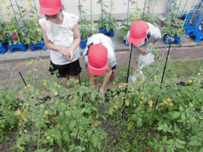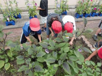 中庭で育てているキュウリやナスを見に行くと,雑草がいっぱい生えていました。みんなの野菜なので,みんなで草引きしました。今朝まで雨が降っていたので,とても抜きやすかったようで,手にいっぱいの雑草を見せてくれました。みんなのために一生懸命行動してくれる素晴らしい姿でした。