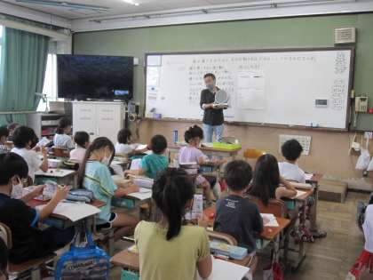今日は,自分で作った風の力で動く車を使って,風の強さを変えた時の車の進む距離の変わり方を比べながら調べました。