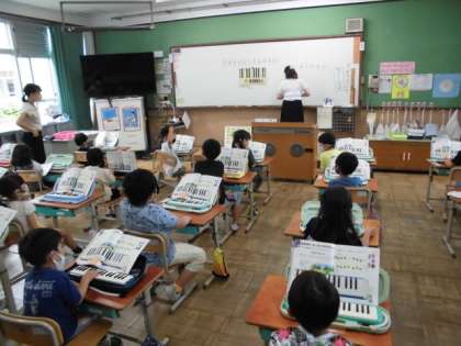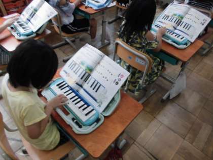 音楽の時間には,鍵盤ハーモニカを使いました。演奏するためにどの指でどの音を押さえればいいか学習しました。今日は,ド・レ・ミの場所を見つけて,「ドレミ ミレド」と順番に押さえていました。