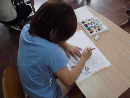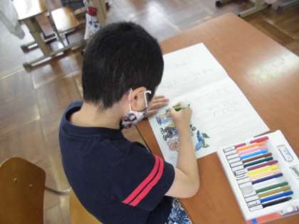 昔話にある「ももたろう」を少しずつ視写しています。今日はお話の終わりの部分にあたる「おにをたいじして みんなはよろこびました」というところを写しました。丁寧に写せたら挿絵に色を塗りました。