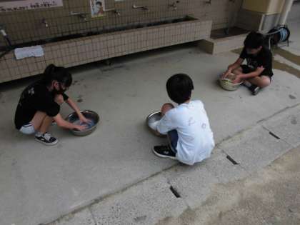 普段,自分達の衣服は洗濯機で洗っていますが,洗濯機がなかった頃は,洗濯板を使ったり手もみで洗ったりしました。みんなの分となると,とても疲れたのではないかと想像できます。今日は,学校にあるビブスを使って手もみ洗いに挑戦しました。少し洗った後,水が汚れていたことから,ビブスの汚れが落ちたことに気づいていました。
