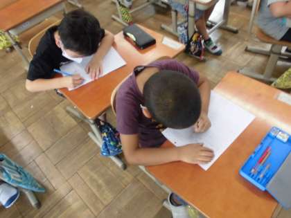 これまでたくさんのひらがなを学習してきました。今日は,五十音表をなぞっていきました。教えてもらった書き順や注意事項を思い出しながら,丁寧に書いていました。