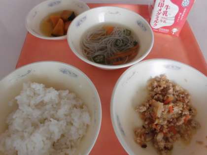 『とりそぼろ丼(具)』は,鶏ミンチ肉・しょうが・にんじん・しいたけ・玉ねぎを炒めて,さとう・みりん・しょうゆで調味して,汁気がなくなるまでいりつけて仕上げました。教室でご飯にのせて食べました。