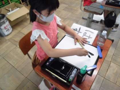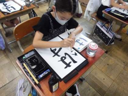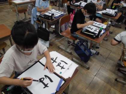 「は」や「す」にある結びの部分に気をつけて書きました。縦向きの結びと横向きの結びでは筆づかいが少し違うので難しそうでしたが,よい姿勢できれいな字を書こうと集中している姿が見られました。