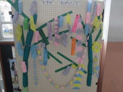 あいにくの雨模様ですが,今日は七夕の日です。職員室の前には,学級で考えた願い事が飾られています。また,別のところには子ども達の作った七夕飾りがありました。1年に1度のことですが,みんなの願い事がかなうといいですね。