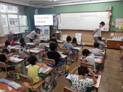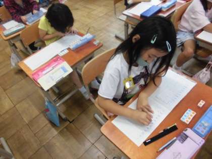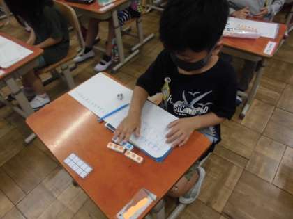 まるいクッキーは6まい,しかくいクッキーは4まいある時,ちがいはいくつか考えました。数図ブロックを操作しながら,式と答えをノートに書いていました。