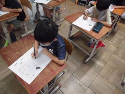 書写の時間には,「マラソン」「ラッコ」「シーツ」などのカタカナを丁寧に書きました。「シ」と「ツ」の違いや二度書きしないように気をつけながら集中して書いていました。