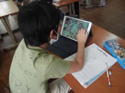 タブレットで撮った写真を見ながら観察カードを描きました。写真を拡大できるので,葉の形や大きさ,つるの伸び方など細かいところまでじっくり観察していました。