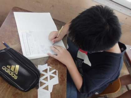 三角形の3つの角の大きさについて調べました。二等辺三角形や直角三角形などいろんな三角形がありますが,3つの角について何かきまりがないか調べました。同じ三角形の向きを変えて並べてみると,ぴったり直線になりました。