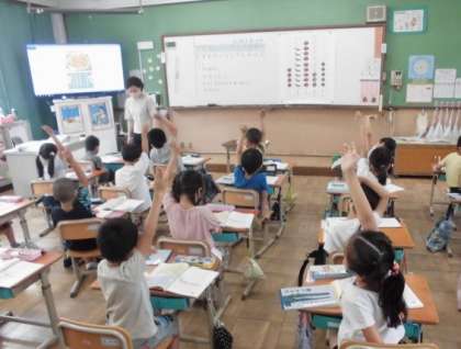 算数の時間には,数を整理する学習をしました。りんご,みかん,バナナなどの果物がありますが,それぞれ数が違います。同じ種類ごとにまとめて色を塗りました。集めて並べると,どの果物が一番多いか,ひと目で分かることに気づきました。