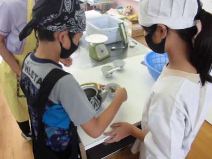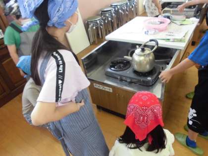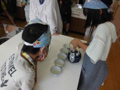 家庭科の時間には,茶葉を使ってお茶の入れ方を学習しました。人数分の水を量ってやかんに入れてお湯を沸かしました。その間に人数分の茶葉を量って用意したり急須やコップの準備をしました。お湯が沸いて急須に入れ,コップに注いでいる時,どんなお茶が出てくるのかみんなで見守っていました。「いつも飲んでいるお茶より香りがする。」という感想が聞かれました。