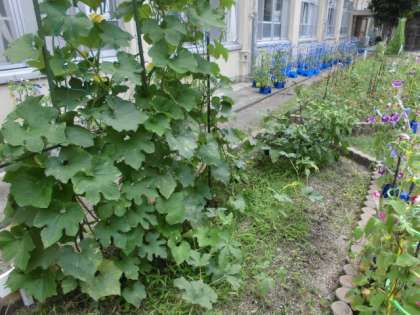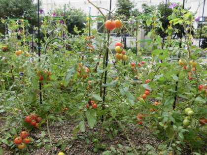 毎日,丁寧にお世話してくれているおかげで,中庭の野菜も大きくなってきました。トマトやナスは実をつけていました。どんな花が咲き,どんなふうに実になっていくのか,見てほしいです。