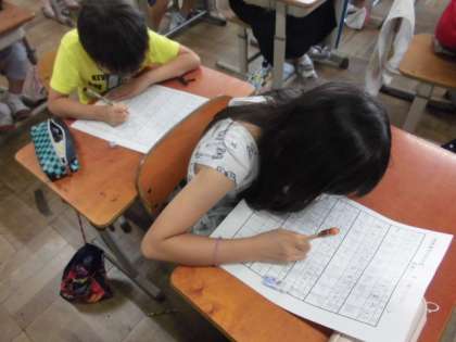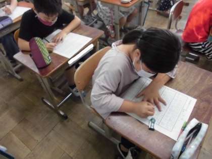 1学期にもたくさんの漢字を学習しました。3年生になると,少しずつ難しい漢字も出てきます。これまでに学習した漢字を思い出しながらプリントに取り組みました。画数が多くても文字のバランスに気をつけながら書いていました。