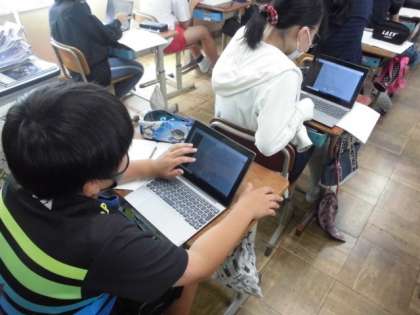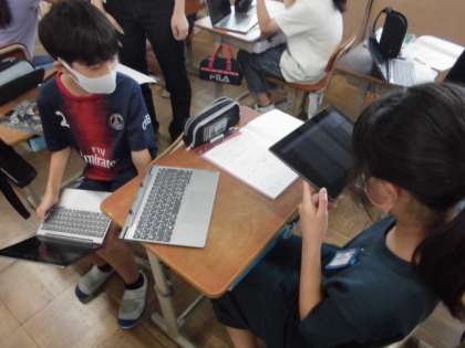 算数の時間には,算数ひろばの問題に取り組みました。日本は国土の2/3が森林で覆われていますが,一体どれぐらいの広さなのか考えました。自分で考えたことノートに書き,それを写真に撮って,タブレットで提出しました。ロイロノートでみんなの解答を共有すると,友達がどんな解き方をしているのかよく分かりました。