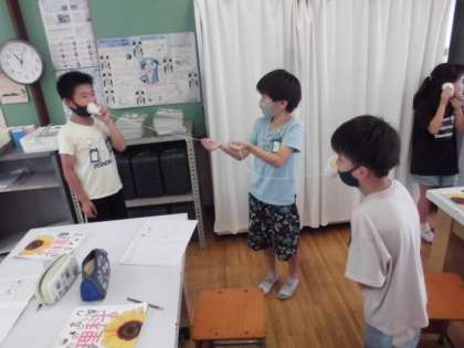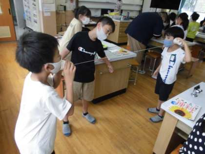 理科の時間には,音がつたわる時,どうなっているのか糸電話を使って調べました。少し距離をとりながらマスクをつけて話してみると,糸がピンと張っている時に音が聞こえてきました。その時,糸をよく見ると震えていることが分かりました。