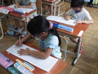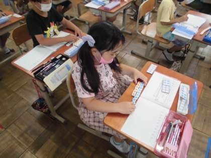 クレヨンが6本,色鉛筆が10本ある時,ちがいはいくつか考えました。数図ブロックを並べて同じ数だけ取ってみると,残った数が分かりました。それをノートに図と式で整理することができました。自分なりに分かりやすい図になるように工夫していました。