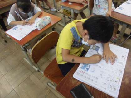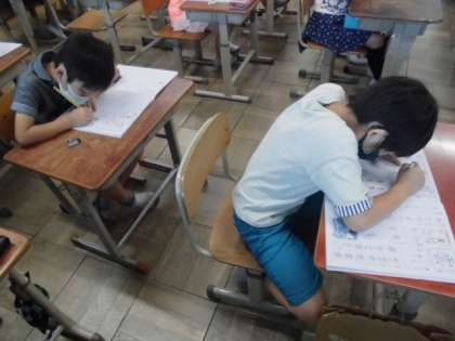 「白い雲」の雲,「夏まつり」の夏,など2年生になると,画数の多い漢字も出てきます。お手本の字からはみださないように丁寧になぞって練習していました。