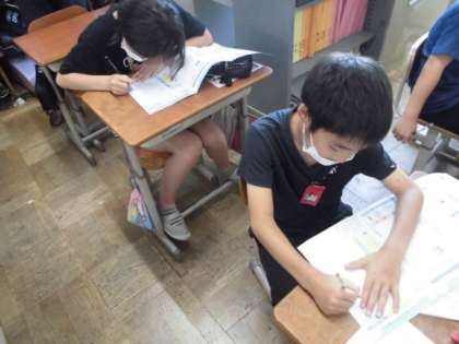 新しい年の始まりには,「年賀状」を出して新年のご挨拶をするように,夏にも「暑中見舞い」を出して暑い気候ですがお元気ですか?とご挨拶する習慣があります。今日は,書写の時間に自分の出したい相手に暑中見舞いを書きました。名前や住所,郵便番号など書く場所が決まっているので,はがきの使い方に気をつけながら書いていました。