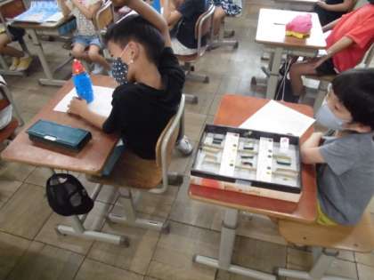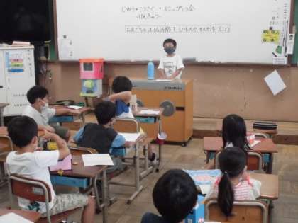 夏休みの宿題として,自由研究や工作など自分で決めたテーマでがんばってきた作品があります。今日は,自分がどんなことをがんばってきたか紹介しました。きれいに作ったり工夫を凝らしたりしていろんな作品がありました。