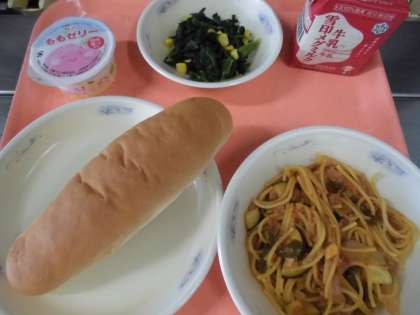 子供たちから,「『イタリアンスパゲティ』は,パスタとズッキーニの相性が良くて,美味しかったです。『ほうれん草のソテー』は,ほうれん草の緑色とコーンの黄色がきれいで,おいしかったです。」と,感想をくれました。