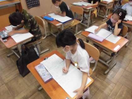 国語の時間には,「ことばあつめ」をしました。プリントに印刷されているひらがなの表をよく見て,かくれている言葉を探しました。「いぬ」や「くま」など2文字の言葉からもっとたくさんの文字数の言葉を見つけていました。「ごま」は反対から読むと「まご」なので2つあったと教えてくれました。