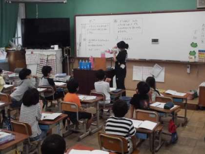 算数の時間には,水のかさについてどちらが多いか調べました。大きいペットボトル2本と小さいペットボトル4本ではどちらが多いのかそのままでは分かりません。そこで,バケツに入れて比べることにしました。1Lマスに何杯分あるのかみんなで数えるようにしました。