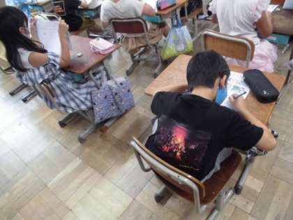 算数の時間には,「長さ」の学習が終わったのでテストをしました。単位に気をつけながら答えたりたし算なのかひき算なのか考えて式を立てたりしていました。1つ1つじっくり考えながら答えている様子が見られました。
