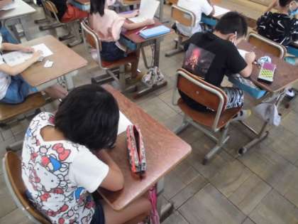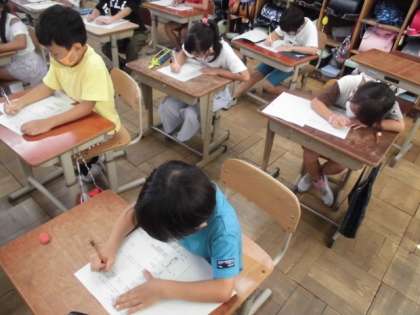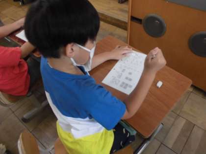 算数では,「L(リットル)」という単位について学習しました。今日は,1リットルにならない量を表すためには,新しい単位「dL(デシリットル)」を使うといいことが分かりました。その後,おさらいプリントで分かったことを確かめていました。