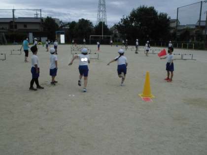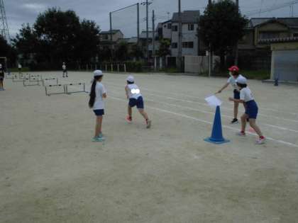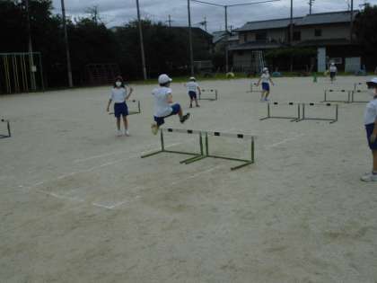 体育の時間には,ハードル走に取り組みました。グループごとに分かれてハードルを並べたレーンを用意して順番に走ってタイムを計測しました。スタートの合図をする人やハードルを直す人など役割を交代しながら学習を進めることができました。