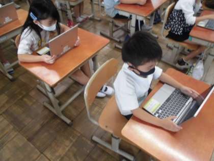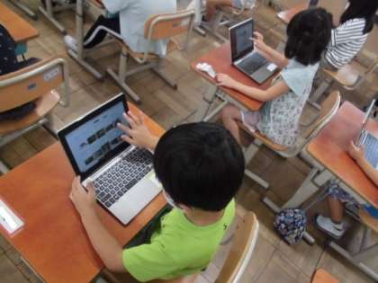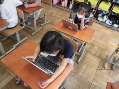 図工の時間には,お話の絵に取り組みました。先生に読んでもらったお話には「カメレオン」が出てきます。さて,カメレオンってどんな生き物だろう?身近にいる生き物ではないので,タブレットを使って調べることにしました。いろんなカメレオンが見つけられたので,どんな生き物なのかイメージがもてていました。