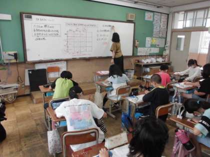 算数の時間には,たて6cm横8cmのタイルを使って正方形を作ることができるか考えました。「たてと横の長さが同じ」という正方形の特徴を生かして,どんな風に並べるとよいか公倍数に着目していました。
