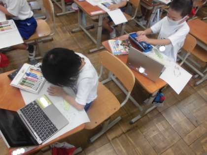 図工の時間には,旅するかき氷屋さんをしているカメレオンの話をもとに「お話の絵」を描きました。前の時間にカメレオンってどんな生き物か調べたので,それをもとに自分で決めた場面の下絵を描きました。