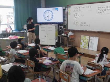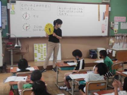 算数の時間には,時計の読み方を学習しました。長い針が「分」で短い針が「時間」を表すことを知りました。その後,針の位置に気をつけながら,いろんな時間について「○時○分」と答えていました。