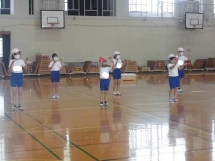 体育の時間には,「鳴子おどり」に取り組んでいます。みんなで動きを確認しながら鳴子を鳴らすタイミングを知りました。まだ始まったばかりなので,これから動きや音を合わせていけるようにがんばります。