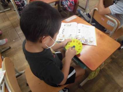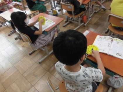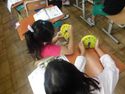 算数の時間には,時計の読み方を学習しています。今日は「○時半」という時間について学習しました。○時を過ぎてから長い針が「6」のところまできたら「○時半」となります。先生から出された問題を見て,自分の持っている時計の針を動かして時刻を合わせていました。