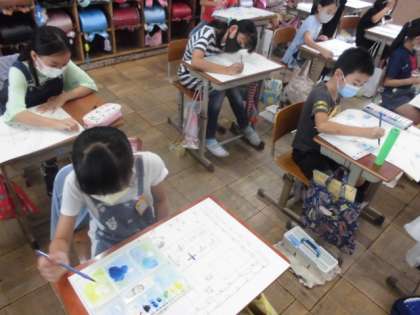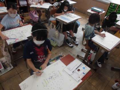様々な色を使って自分の想像した様子を表現するために,色の塗り方を工夫しました。薄い色から塗ることや色を混ぜて作ることなどを意識して塗りました。