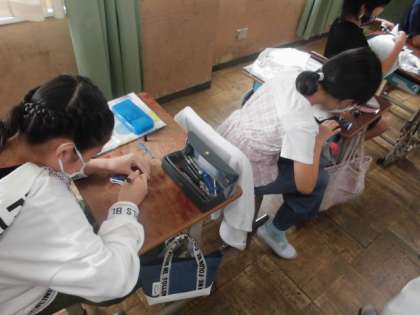 エプロンづくりに挑戦する前に,いろんなパーツに自分の名前を書いたり,紙で試作したりしました。どこにどんな部品を使うのか,どんな工程で作っていくのか分かりました。