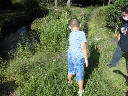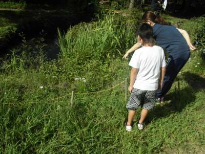 クラスの隣に植えているサツマイモがずいぶん大きくなりました。つるも伸びて葉も大きくなりました。その様子を見た後,秋を見つけに広場へ行きました。白い花やカエル,バッタなどいろんな生き物を見つけていました。
