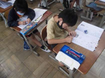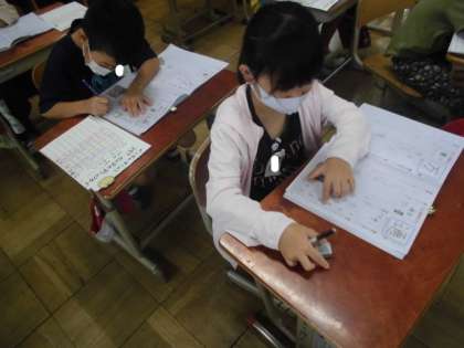 今日,学習する漢字は「通」と「万」です。筆順に注意して大きなお手本をなぞったら,何度も練習しました。漢字の使い方も大切なので,どんな言葉で使う漢字なのか,合わせて練習しました。