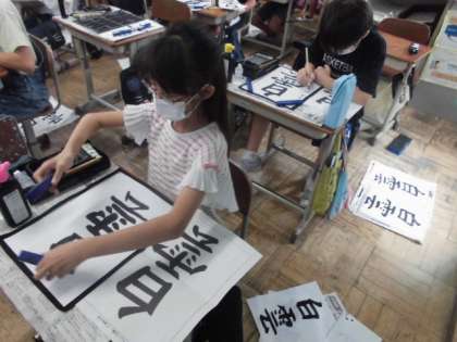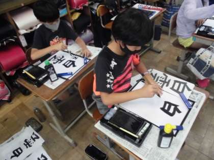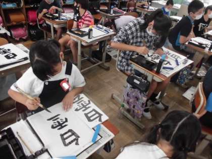 書写の時間には,毛筆で「白雲」と書きました。白と雲を同じ大きさに書くのではなく,少し大小をつけて書きます。画数の少ない「白」をやや小さめに書くことで,バランスが良くなることを意識して書くようにしていました。