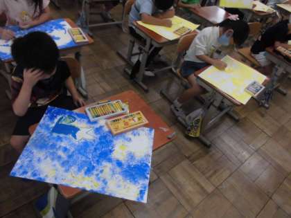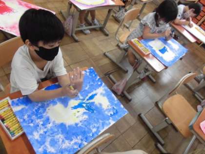 お話の絵の背景が出来上がったので,今日は,カメレオンに色を塗りました。自分はどんなカメレオンを描きたいのか思い出しながら,隙間を作らないようにクレパスでしっかり塗っていました。