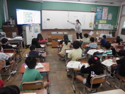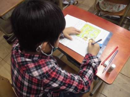 国語の時間には,教科書の挿絵を使って,目的の場所までの道案内を考えました。信号やベンチなど目印になるものを挙げながら,どのように伝えれば相手に分かってもらえるか悩んでいる子もいました。